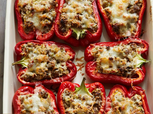 In a separate bowl mix 1 cup of the salsa, the rice, sour cream and green onions. Add the ground beef mixture and combine thoroughly. Stuff the mixture into the peppers. Sprinkle each pepper half with 2 tablespoons of the cheese.