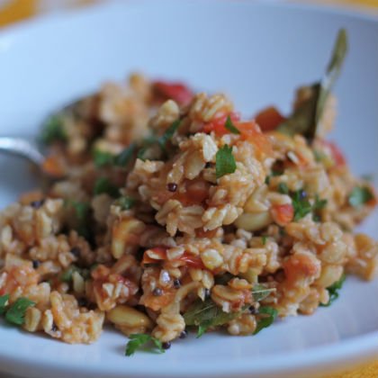 2. Heat canola oil in a skillet over medium-high heat and add mustard seeds. When they start to pop (about 1 to 2 minutes), add peanuts, onion, serrano, ginger, chili powder, and curry leaves. Stir and cook about 3 minutes, until peanuts are lightly toasted and spices are aromatic. Add tomato and salt to taste. Pour in oatmeal and cook another 1 to 2 minutes, until heated.