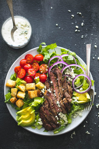 Arrange salads with lettuce on the bottom, then top with steak, avocados, red onions, tomatoes, croutons, blue cheese crumbles, and blue cheese dressing. Serve immediately.