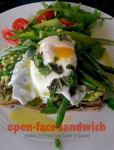 Mash up the avocado with a fork and season with a dash of sesame oil, sea salt and freshly grated black pepper. Toast the bread slices. Smear a generous portion of the mashed avocado on each slice of bread. From here it’s up to you on how you want to build it. I added minced garlic and spring onion. I piled the snow peas and string brings on top and left the arugula, tomato slices and cucumber slightly to the side. Crown with a soft poached egg. Scatter mint and a splash of olive oil over the poached egg.