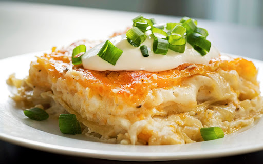 4. Place 4 lasagna noodles in an even layer on bottom of baking dish. Layer ½ of total mashed potatoes on top of noodles, followed by ½ of the sauteed onions, and ½ cup of cheese.