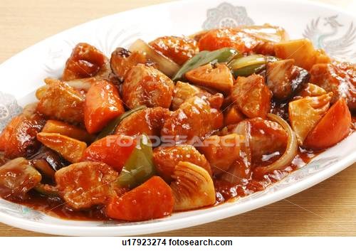 Sautee pork in oil, then add veggies. Blend pineapple juice with ketchup, brown sugar and vinegar. Add to meat and veggies and simmer til all are tender and the sauce is reduced and syrupy. Add pineapple chunks last just to heat through.