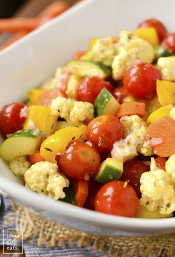 Add vegetables to a very large bowl then dress with 3/4 of the vinaigrette. Toss then refrigerate for 4 hours or up to overnight. Toss with remaining vinaigrette and season with salt and pepper to taste just before serving.