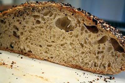 4. At least a half-hour before dough is ready, heat oven to 450 degrees. Put a 5- to 8-quart heavy covered pot (cast iron, enamel, Pyrex or ceramic) in oven as it heats. When dough is ready, carefully remove pot from oven. Slide your hand under towel and turn dough over into pot, seam side up; it may look like a mess, but that is O.K. Shake pan once or twice if dough is unevenly distributed; it will straighten out as it bakes. Spritz or brush the top of the dough with water then sprinkle on remaining 1 Tbsp. Everything Spice. Cover with lid and bake 30 minutes, then remove lid and bake another 15 to 30 minutes, until loaf is beautifully browned. Cool on a rack.