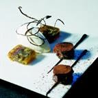 1. Just before serving, assemble the chocolate and eucalyptus encerradito, by placing a ganache cylinder on a chocolate caramel square and then covering with the other square.