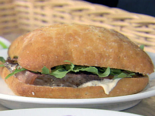 To assemble the sandwiches, spread a tablespoon of Mustard Mayo on the bottom half of each bun. Place a layer the steak strips on top of the mayo, sprinkle with salt and pepper, and top with the caramelized onion rings. Place the baby arugula on top of the onion rings, and cover the sandwiches with the top half of the buns.