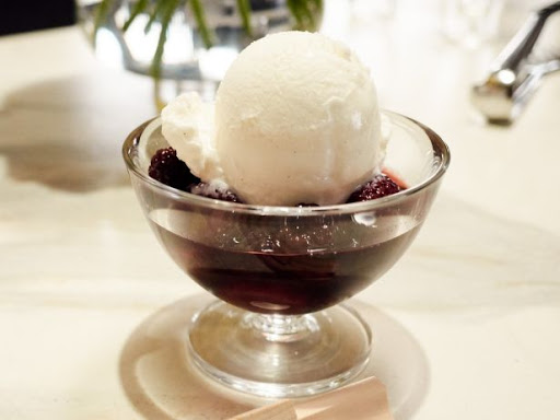 To serve, spoon some of the berries and mulled wine into a cocktail glass. Top with a scoop of ice cream and garnish with some freshly grated cinnamon.