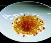 1. Pile up the consommé tagliatelli in the center of a small soup plate, making it look as much like a dish of pasta as possible.