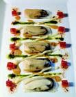 3. Place a horizontal line of praline, parsley oil and garlic purée (in this order), which will be ¼" longer than the mussels on each side, between the mussels.