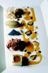 5. Drizzle with the praline, ink vinaigrette and saffron oil and 3 drops of lemon juice around the garlic gelatin.