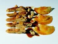 6. Top each of the tongues with a duck scratching and then place the drained diced oysters between the tongues and the turnovers.