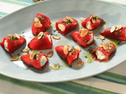 Spoon the cheese mixture into a resealable plastic bag, snip off the tip of one corner and pipe the cheese into each pepper until about three-quarters full. Arrange the peppers on a platter and drizzle with more olive oil and some sherry vinegar. Sprinkle the peppers with the remaining herbs and the toasted almonds before serving.