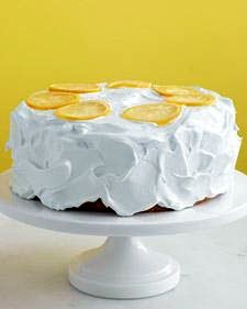 To make the recipe Martha prepared with John Barricelli on "The Martha Stewart Show," follow these instructions immediately before frosting the cake: Place one cake, bottom side up, on a cake stand. Tuck strips of parchment paper underneath. Using an offset-spatula or table knife, spread top with lemon curd. Top with remaining cake; continue frosting top and sides as directed.