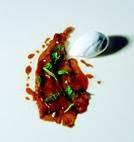2. Arrange the crêpes in a fan on the plate and drizzle with the meat stock and the 0.4º oil.