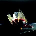 2. Just before serving, place the orange peel in the dish to stop the sorbet from sliding, and place the Campari gelatin on one side.