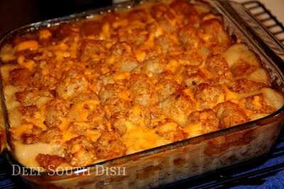 A well loved casserole of ground beef, and I like to also add smoked sausage, seasoned with sweet onion and bell pepper and a cream soup sauce and topped with crispy, crunchy tater tot potatoes and cheese.