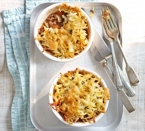 Increase oven temperature to 180°C/160°C fan forced. Grease 4 x 1 1/4 cup ramekins, place on an oven tray. Spoon lamb mixture into ramekins. Top with potatoe mixture. Bake for a further 20 mins or until potatoe is golden