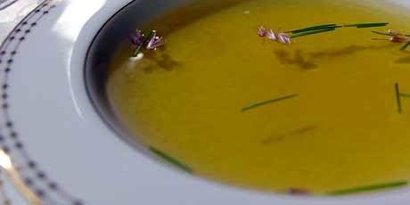 2. Line a sieve with a double layer of cheesecloth. Using a skimmer, lift off as much egg white from the top of the consommé as you can, and discard. Ladle the consommé into the lined strainer and let it drip through in its own good time. Don’t be tempted to press it or you’ll make it cloudy. When it has all dripped through, season and taste the consommé. Serve hot or cold with the garnish of your choice.