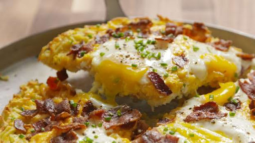 Preheat oven to 400 degrees F. In a large mixing bowl, combine hash browns, 2 eggs, and 1/2 cup cheddar and season with salt and pepper.