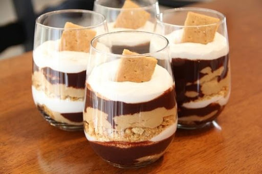 Combine pudding and milk over medium heat and bring to a boil. Remove from heat. Divide mixture between 2 bowls. Immediately stir pb cups into 1 bowl and chocolate chips into the other bowl. Stir until melted and smooth and then cool. Stir occasionally. Spoon alternatively into glass. Cover and refrigerate for several hours. Top with Cool Whip.