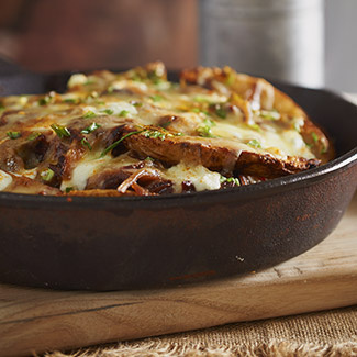 Place the skillet back in the oven and bake for about 10 minutes until the cheese melts and the poutine is hot. Serve immediately with the remaining sauce on the side for dipping.