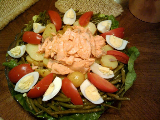 Line plate with lettuce leaves, arrange beans around the outside and spoon potatoes into the center. Make a dent in the mound of potatoes and put salmon in the "potatoe bowl". Alternate tomato and egg wedges over the beans. Garnish with olives. Pour remaining dressing over salad.