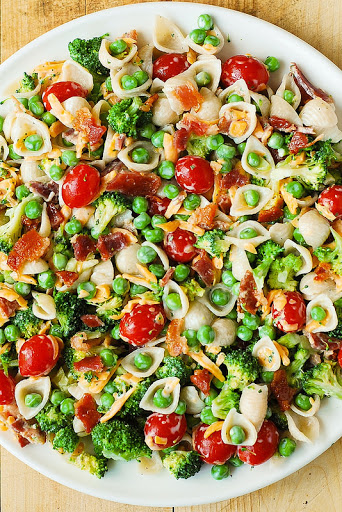 In a large bowl, combined chopped blanched broccoli, chopped cooked bacon, whole cherry tomatoes, shredded sharp cheddar cheese, cooked sweet peas, cooked pasta shells.