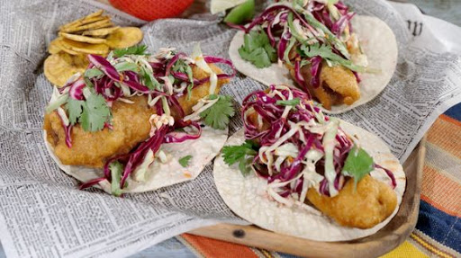 5 Serve the fried fish inn a corn tortilla, top with cabbage slaw. Garnish with desired toppings.