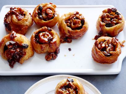 Pour the warm topping into the prepared baking dish. Scatter some additional chopped pecans evenly over the surface. Place the buns in the baking dish, cut-side down. Bake until puffed and golden brown, 25 to 35 minutes.