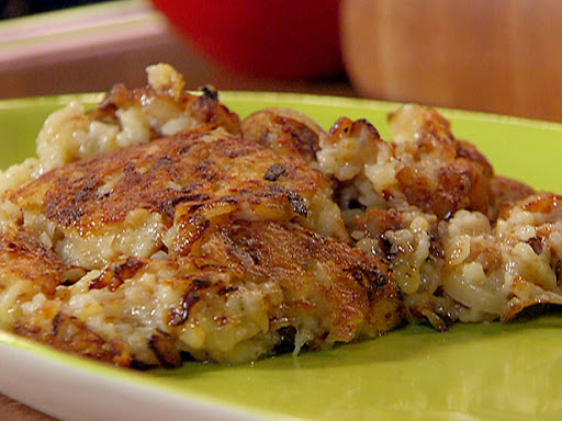 Heat a large skillet with extra-virgin olive oil and butter over medium-high heat. Add onions and let soften 2 to 3 minutes. Add potatoes, season with salt and pepper and cook 20 minutes, turning occasionally, until brown and crispy. Season with a little freshly grated nutmeg, to taste, and add cheese. Turn the potatoes and onions with cheese to melt the crumbles and crisp the cheese a bit, about 1 minute. Transfer to serving dish.