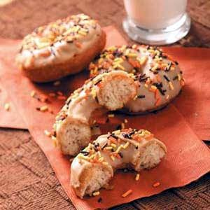 On a lightly floured surface, roll dough to 1/2-in. thickness. Cut with a floured 2-1/2-in. doughnut cutter. In an electric skillet or deep-fat fryer, heat oil to 375°. Fry doughnuts, a few at a time, until golden brown on both sides. Drain on paper towels.