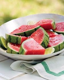 2.Remove watermelon from syrup, and arrange on a platter. Squeeze limes over melon, and season with salt.