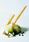 2. Make a small base of crystallized lime and place a large quenelle of banana sorbet on top.