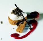 6. Place a small bar of cocoa croquant across the top of the lychee sorbet.