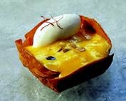 2. Fill the filo tart with the saffron foam and gently warm in the salamandra until a film forms across the surface.