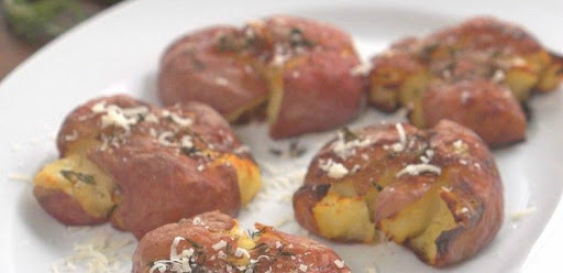 Drizzle olive oil on a sheet pan and place the potatoes on the pan. With the palm of your hand, press down on the center to smash each potato.