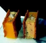 2. Place a slice of mango gelatin and foie gras terrine on a honey gingerbread biscuit.