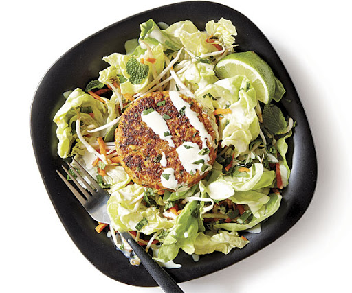 Crumble the tofu into pea-size pieces and add to the quinoa. Mix in the panko, scallion, carrot, peanuts, curry paste, Sriracha, cilantro, and zest. Season to taste with salt and pepper. Stir in the eggs. Chill the mixture for least 30 minutes or up to 4 hours.