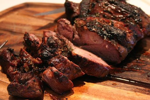 4 Put the lamb, fat side down, on the grill on the hot side. Immediately start basting the meat with the marinade. Sear one side for 6 minutes, then turn the lamb over to sear the other side for another 6 minutes. Continue basting as the meat cooks. Then, if you are using a charcoal grill, move the roast to the less hot side of the grill. If you are using a gas grill, lower the heat to low. You will want to maintain a temperature of 300-350°F. Cover the grill and let cook for an additional 25-35 minutes (depending on how thick, and how many pounds the roast is), until a meat thermometer inserted into the thickest part of the roast registers 130°F (for medium rare).