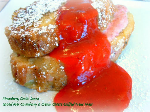 I had some strawberries that were a day past their prime for strawberry shortcake. Not wanting to waste the berries, I decided to cook them into a puree, which I served over Cream Cheese & Strawberry Stuffed French Toast. I was so happy with how the sauce turned out, that I will make this again to serve over ice cream, or even on top of strawberry shortcake. Is it even possible to serve too many strawberries? I don't think so!
