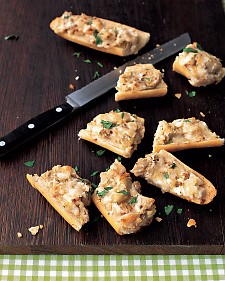 Cut the bread in half lengthwise. Scoop out center with your fingers, and tear into small pieces. Set bread shells aside.