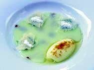 4. Use a coffee spoon to make a quenelle of textured oil and place it opposite the mint gelatin.