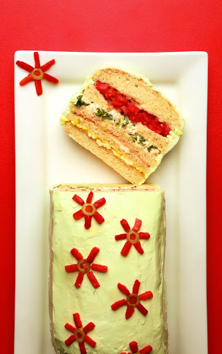 6. Lay bread on its side; cut horizontally into 5 even slices (4 cuts). Spread 3 of the slices with soft butter. Spread fillings on the 3 slices that have been buttered. Spread 2 tablespoons of the mayonnaise on another slice, and arrange chopped tomatoes on that slice. Stack slices to re-form loaf shape.