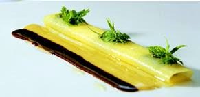 1. Place the polenta cannellone on the right-hand side of a rectangular dish. Brush it with melted butter and heat in the salamandra for 5 seconds.