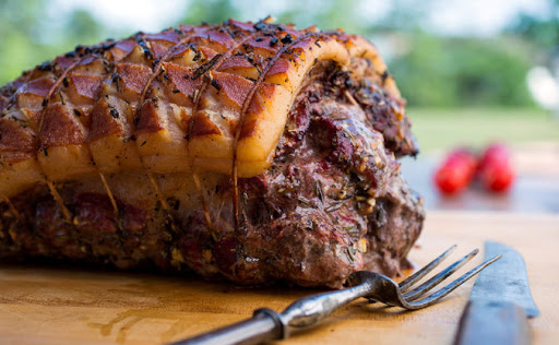 Roast at 350 to 375 degrees (the temperature can hover between the two), turning occasionally, until a meat thermometer inserted into the thickest part of the roast registers 140 degrees, about 3 to 4 hours. (The temperature will continue to rise as the meat rests.) If the meat is cooked through but the skin is not crisp, move the roast to the part of the grill that sits over direct, high heat. Cook with the grill open, turning often, just until sizzling and crisp (not more than 10 minutes, to prevent overcooking).
