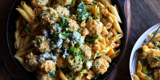 In the same cast-iron skillet over medium-high heat, add cooked penne to the meatballs and reserved hot sauce mixture. Add pasta water until pasta reaches desired consistency. Top with crumbled blue cheese and scallions and serve.