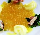 1. Mix the Iberian ham stock with the agar-agar in a pan. Stirring continuously, bring to boil . Remove from the heat and whisk.
