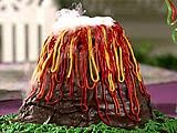 To decorate, frost outside of entire cake with remaining chocolate frosting. Place the cake crumbs around the base of the cake. Pipe green icing around the entire bottom of the cake for "grass". To create "flowing lava" pipe red icing a quarter from the top of cake in downward strokes to the middle of the cake with ribbon tip. Repeat technique with orange icing, starting almost at top of cake and ending where red icing begins with slight overlap. Repeat technique with yellow icing starting at the very top of cake and overlap orange icing. Drizzle yellow and red gel coloring around the very top of cake.