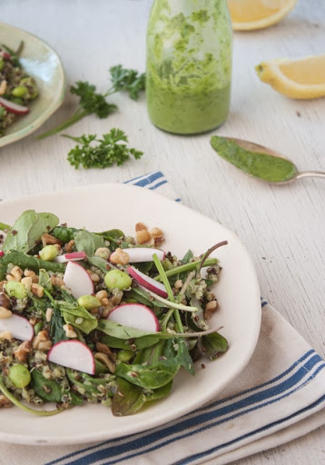 While the quinoa is still warm, toss it with the mixed greens so the leaves wilt down a bit. Stir in the edamame, walnuts, radishes, crushed red pepper flakes, salt and pepper. Slowly drizzle in the dressing. Serve warm or at room temperature.