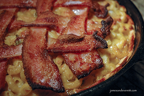 Place back in the hot oven, and bake for 15 – 20 minutes, or until bacon is crisp and the cheese is bubbling. Allow to rest for 5 – 8 minutes before digging in.